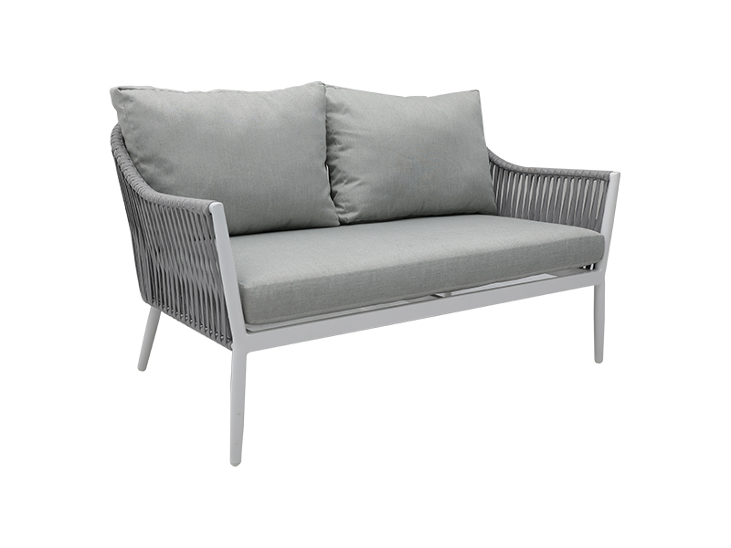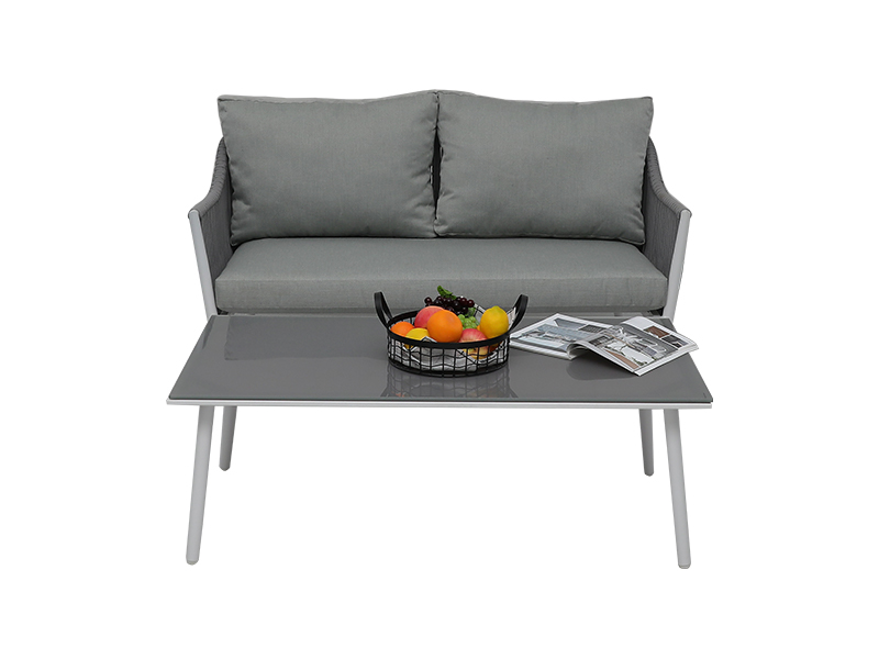 | Spesifikasjon | aluminiumsramme med flettet tau, totalt 4 stk; loveseat: L75*B135*H76cm, 1 STK enkeltstol: L75*B75*H76cm, 2STK salongbord: L114*B60*H38,5cm, 5mm herdet grått glass, 1STK |