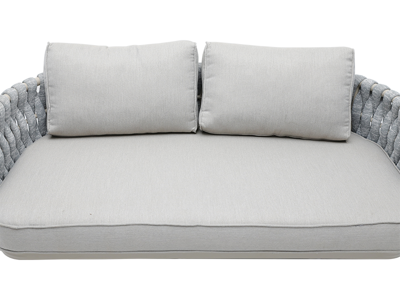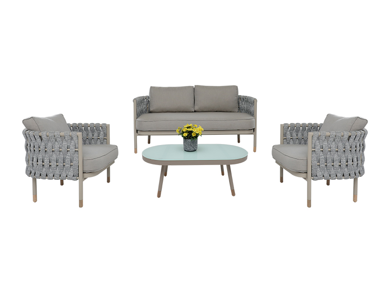 | Spesifikasjon | aluminiumsramme med flettet tau, totalt 4 stk; loveseat: L73*B141*H63cm, 1 STK enkeltstol: L73*B75*H63cm, 2STK salongbord:L100*B50*H38cm, 5mm herdet hvitt glass, 1STK |